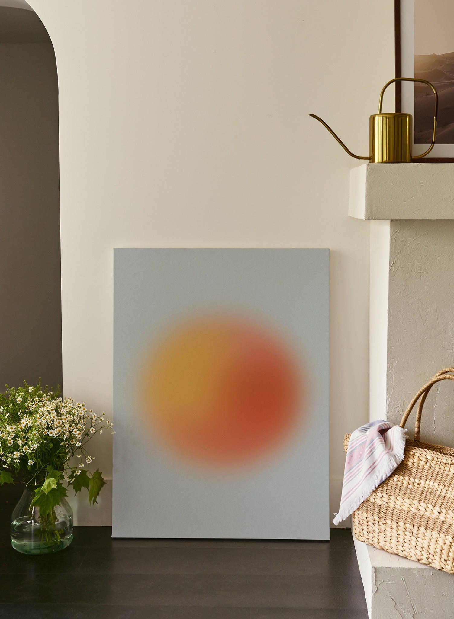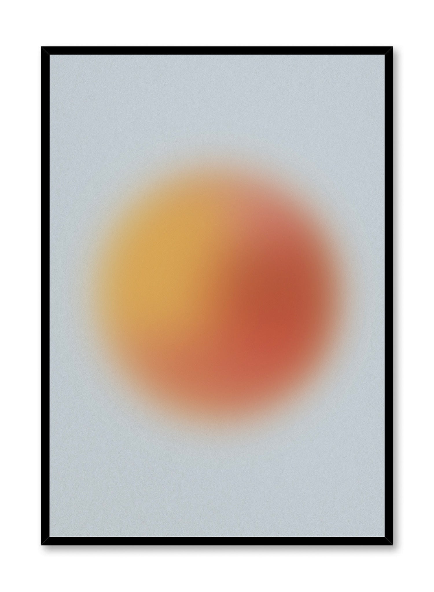Infuse a little fun in your decor with 'Bubbly in Blue': a playful abstract print featuring a bold and blurry orange sphere layered over a baby blue background.