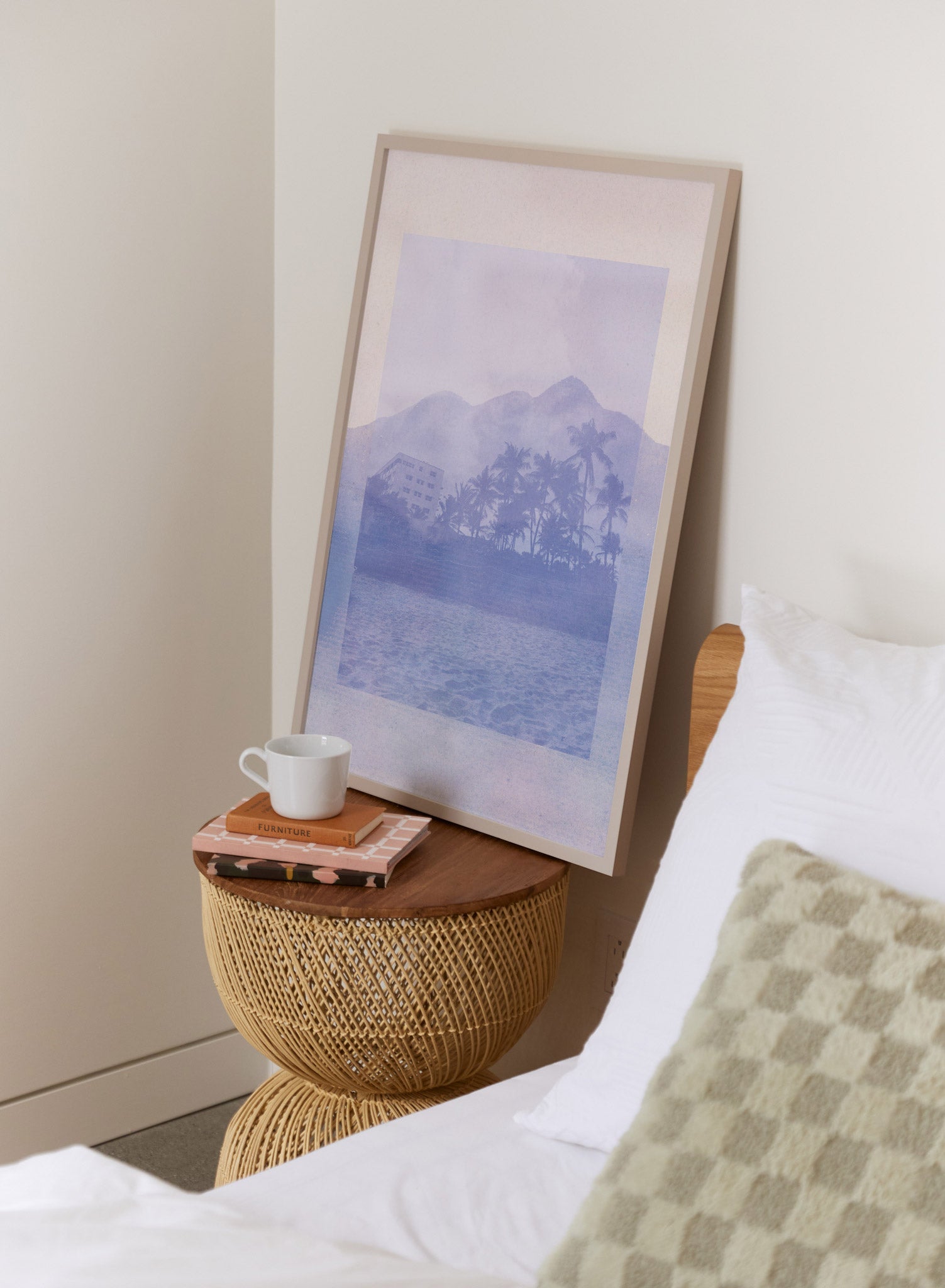 On Gilligan's island, life is simple and oh so beautiful. This collage print features a tropical island with palm trees and mountains by the beach. A grainy blue filter completes this dreamy look.